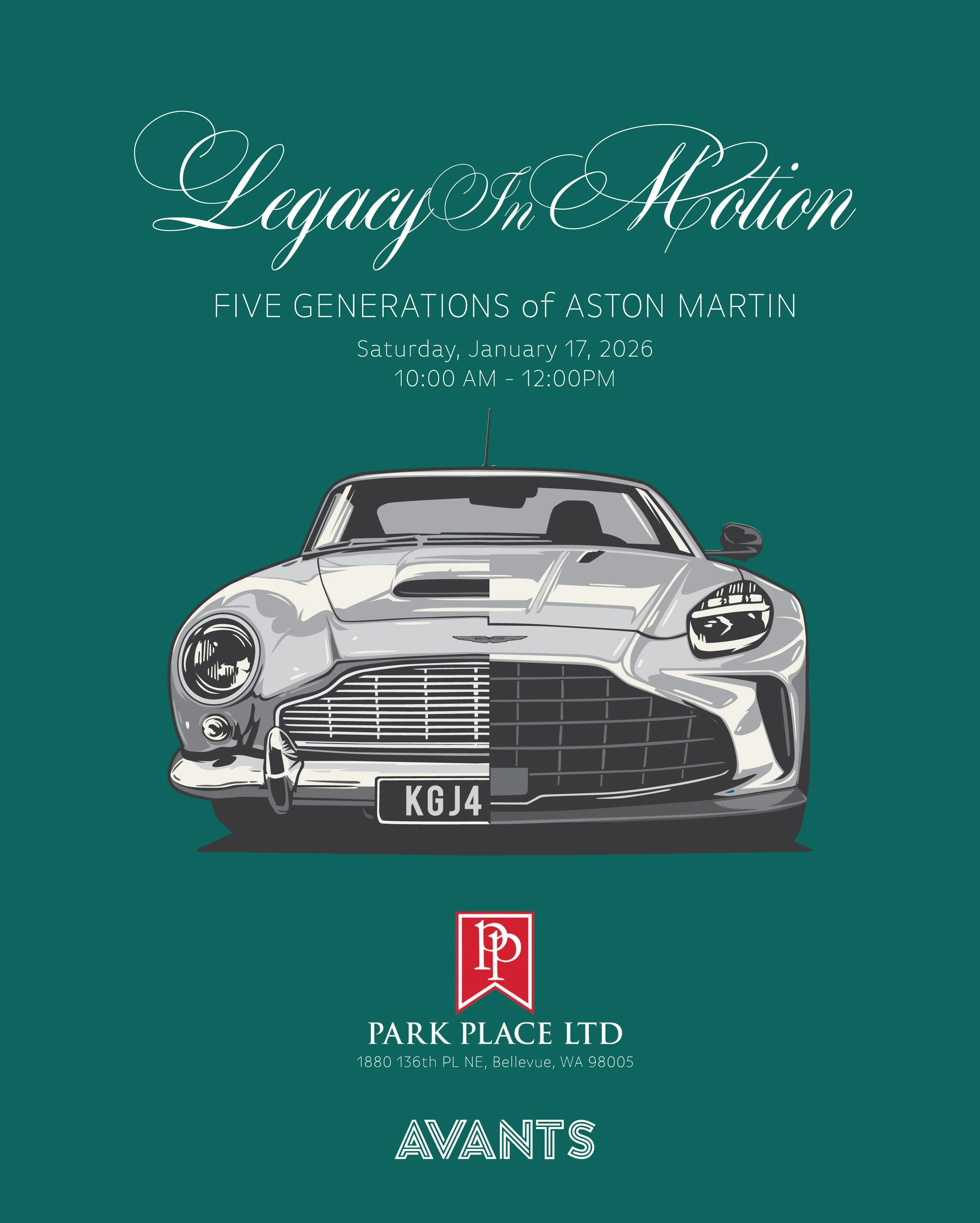 Avants is proud to partner with Park Place LTD to present Legacy in Motion, a curated morning experience celebrating five generations of Aston Martin—one of the most iconic marques in automotive history.